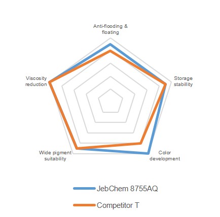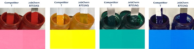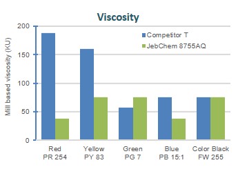 JebChem 8755AQ gives excellent absorption on surfaces of various types of organic pigments and performs superior dispersion. Viscosity reduction of pigment concentrates can be observed. Provides well-controlled flocculation and enhanced colour development.