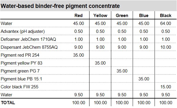 Polymeric water-based dispersing agent for Organic binder-free pigment concentrates.